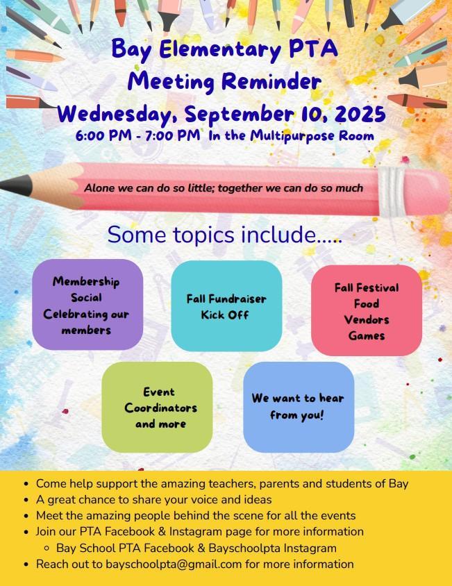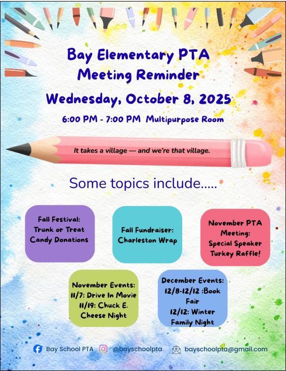 Bay PTA Meeting 10/8 6pm in the Multipurpose Room